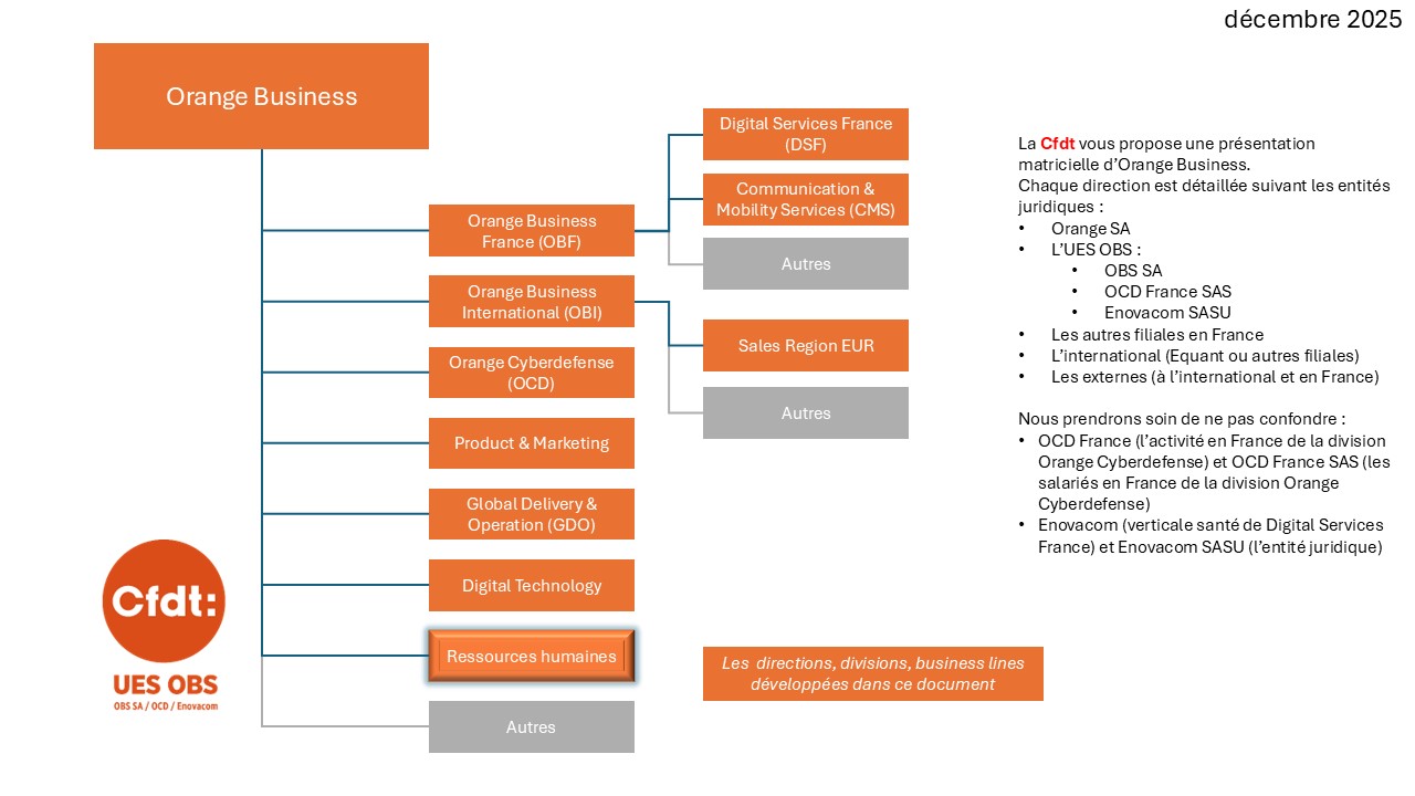 L’organigramme simplifié ci-dessous vous invite à explorer les différentes directions présentées (sélectionnez une division pour pouvoir naviguer). Chacun des articles correspondants s’attache à analyser l’emprise de l’UES OBS au sein d’Orange Business.