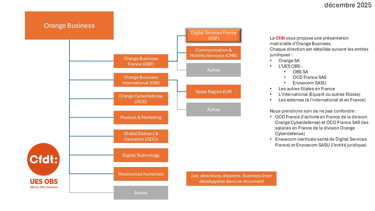 L’organigramme simplifié ci-dessous vous invite à explorer les différentes divisions présentées (sélectionnez une direction pour pouvoir naviguer). Chacun des articles correspondants s’attache à analyser l’emprise de l’UES OBS au sein d’Orange Business.